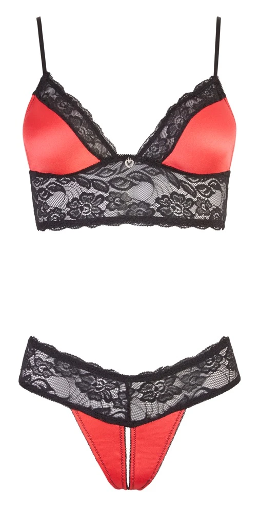 Süßes Ensemble bestehend aus Soft-BH und passendem String. Der BH verfügt über ein breites Unterbrustband aus edler, schwarzer Spitze und rote Satin-Cups. Die Träger sind verstellbar und ein kleines Strassherz zwischen den Cups lenkt alle Blicke auf Dich. Der dazugehörige String besteht ebenfalls aus schwarzer Spitze und rotem Satin und ist im Schritt verführerisch offen.