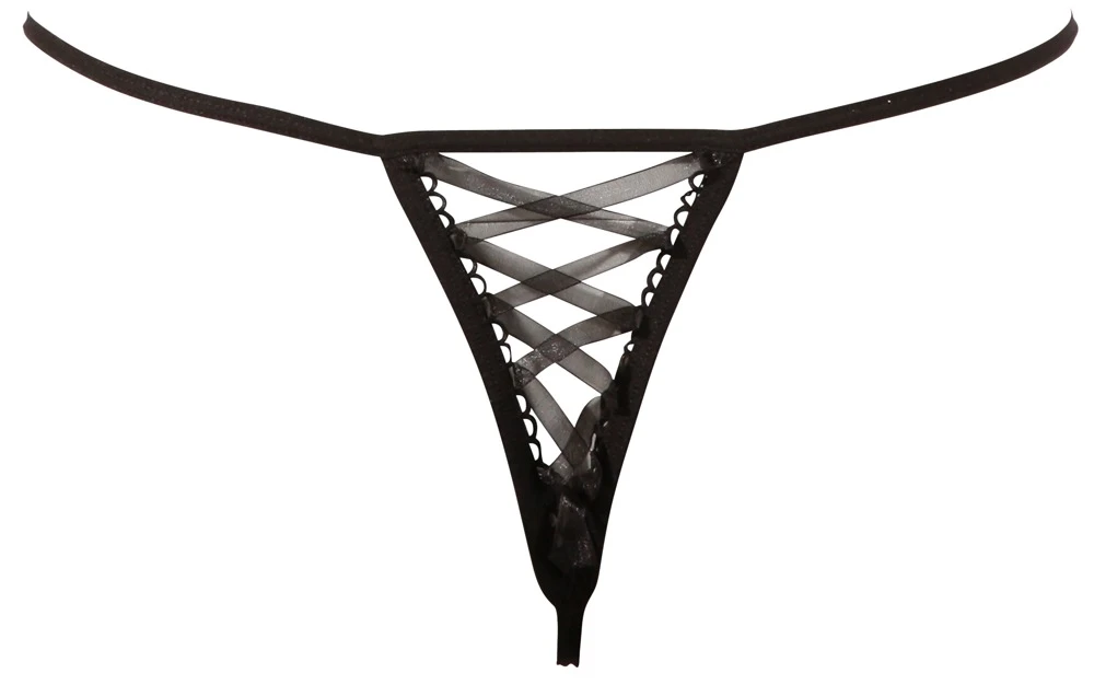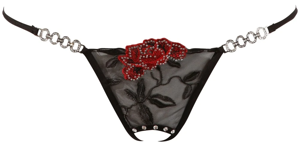 • Schnitt & Material: String ouvert mit offener Scham. Vorne zweifarbige Stickerei und Strass-Details. Hinten Zierschnürung über dem Steißbein. 100% Polyester.
