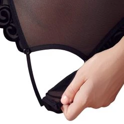 Wie wäre es dann mit diesem heißen Stringbody in verführerischem Schwarz als Strip-Outfit? Mit einem einzigen Ruck können Sie nackte Tatsachen schaffen, sodass die Cups aus süßem Flockprint Ihren blanken Busen freilegen. Präsentiert wird Ihre Oberweite dann von einer leicht gepolsterten Bügel-Hebe mit kleinem Strassaccessoire zwischen den Cups.