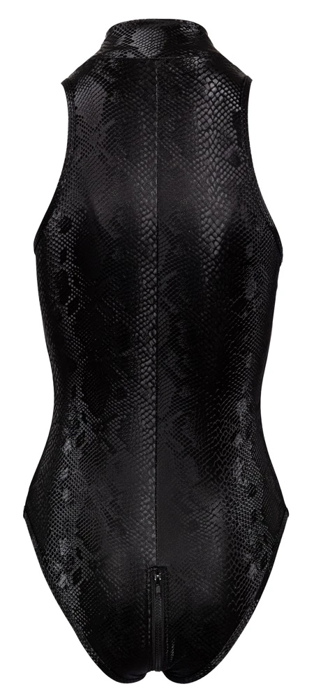 • Schnitt & Material: Body in mattglänzend schillernder Schlangenhaut-Optik. Mit 2-Wege-Reißverschluss vom Stehkragen durch den Schritt bis zum Po. 90% Polyester, 10% Elasthan, Polyurethan-Beschichtung.