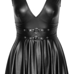 • Schnitt & Material: Kurzes, oben eng geschnittenes Kleid im schwarzen Mattlook mit ausgestelltem schwingendem Rock-Teil. Vorne extra tief in V-Form ausgeschnitten. In der Taille zwei mit Ringen verstellbare Gürtel. 90% Polyester, 10% Elasthan.