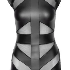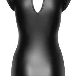 • Schnitt & Material: Tailliertes kurzes Kleid im schwarzen Mattlook mit transparenten Powernet-Einsätzen in der Front. Stehkragen mit 2 Knöpfen im Nacken, darunter großer ovaler Ausschnitt im Rücken. 90% Polyester, 10% Elasthan; Powernet 90% Polyamid, 10% Elasthan.