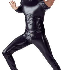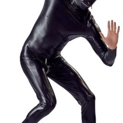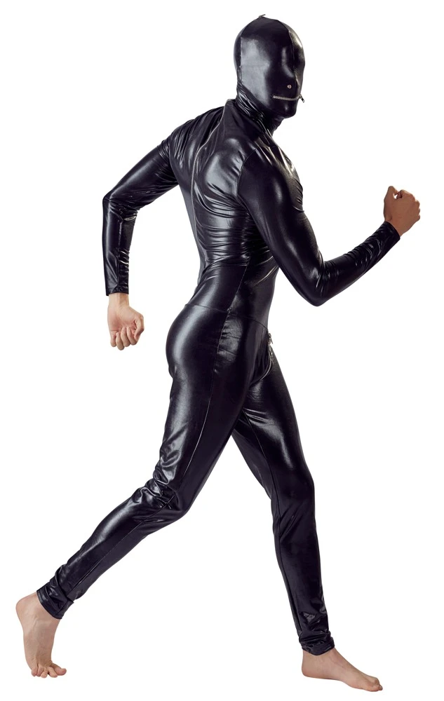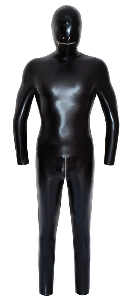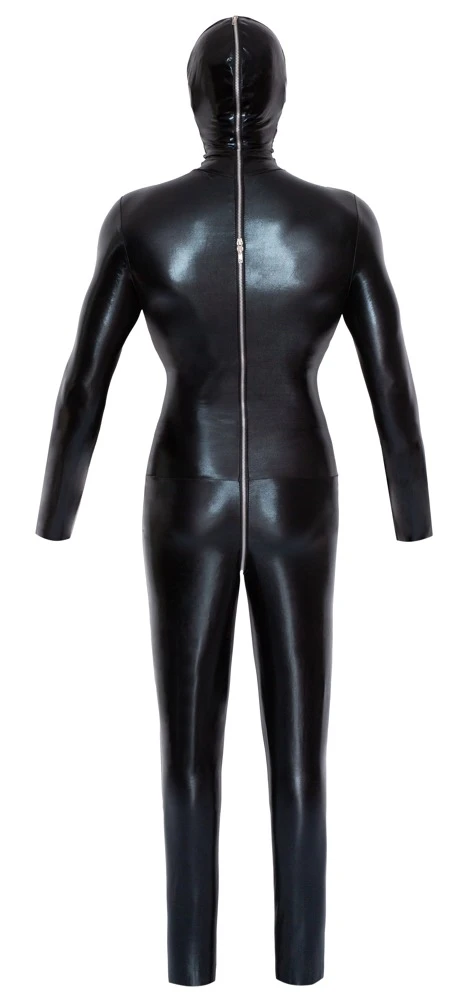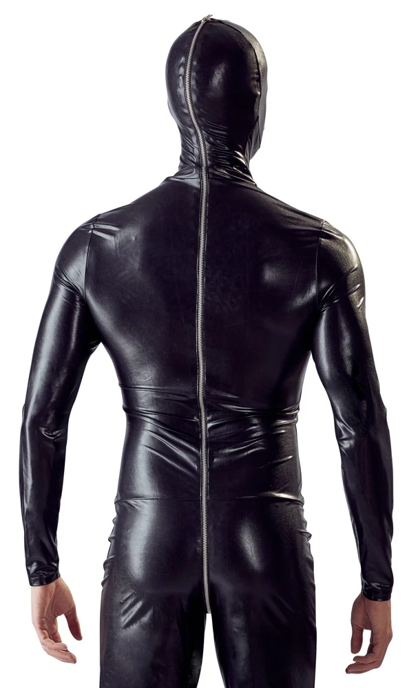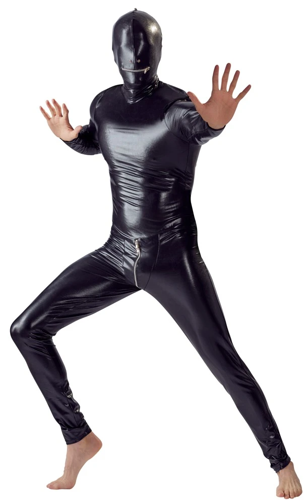 • Schnitt & Material: Glänzender Totalanzug mit Ösen für die Nase, Reißverschluss am Mund sowie langem 2-Wege-Reißverschluss. 87% Polyester, 13% Elasthan.
