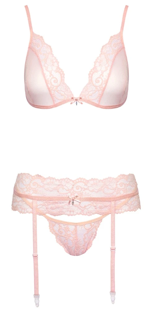 • Schnitt & Material: Soft-BH, Strapsgurt & String im Set aus feinem Tüll und zarter Spitze, roséfarben. BH und Strapsgurt mit Hakenverschluss im Rücken, Träger und Strumpfhalter verstellbar. Die schmalen Stretchriemen des Strings vereinen sich im Schritt. 90% Polyamid, 10% Elasthan.