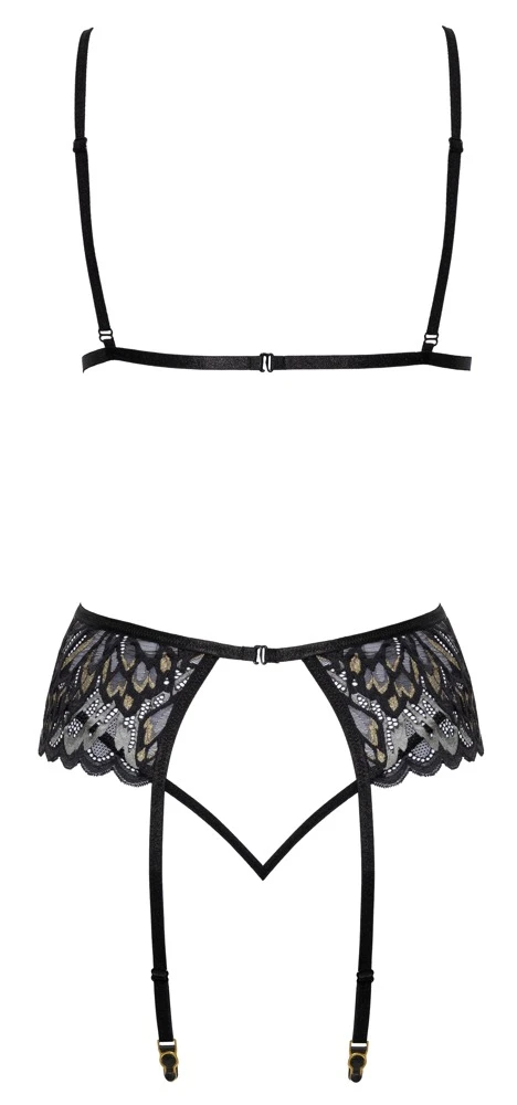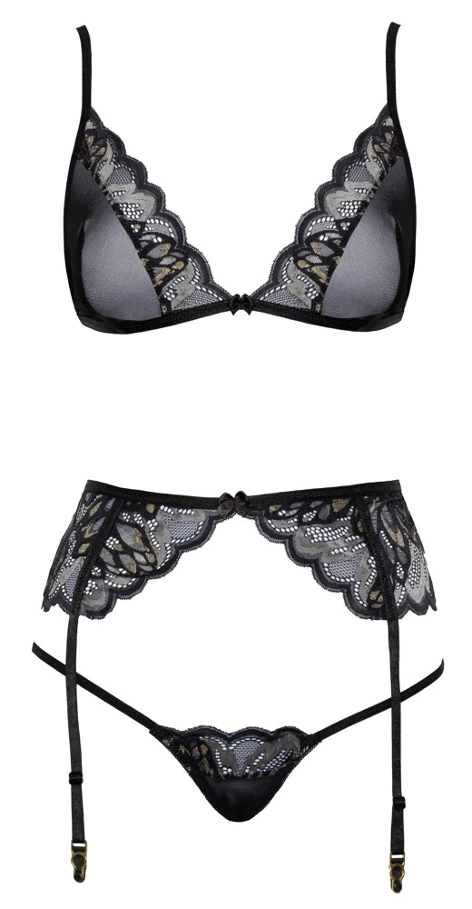Dieses hinreißende Straps-Set punktet mit seinem puristisch eleganten Styling und seiner wunderschönen Effektspitze, die sich herrlich weich anschmiegt. Besonders edel ist die Farbgebung mit Schwarz als Basis und feinen silber- und goldfarbenen Spitzendetails. Mit den verstellbaren Trägern und Strapsen ist alles schnell auf deine Passform gebracht. Dann brauchst du nur noch deine Nylons anclipsen …