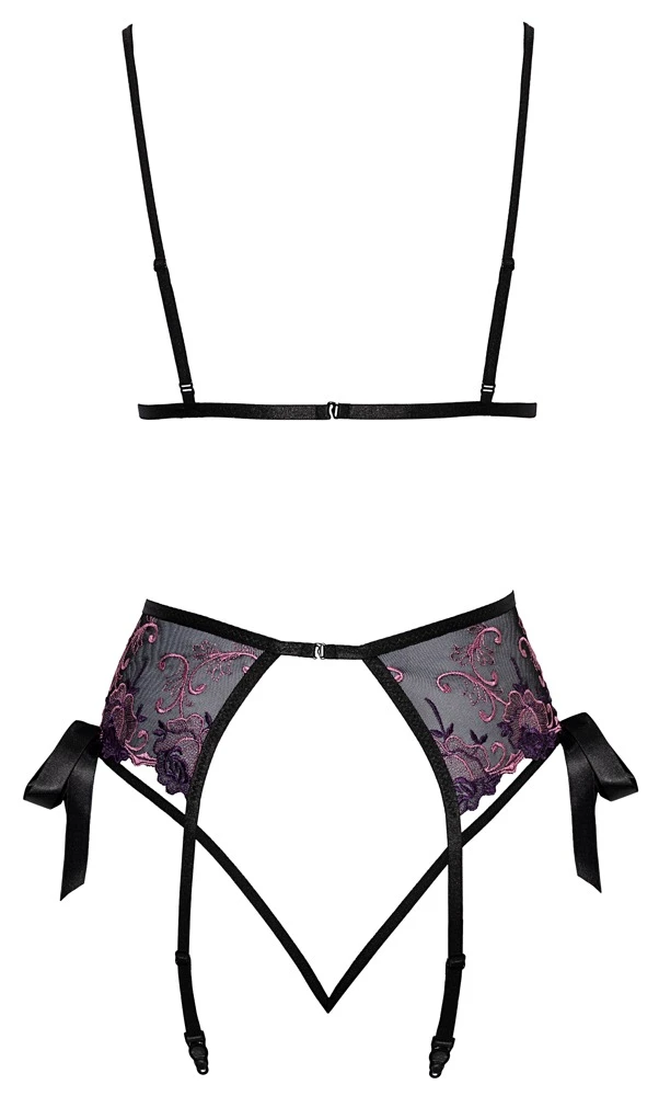 âą Schnitt & Material: Soft-BH, Strapsgurt & String im Set komplett aus feinem schwarzem Powernet mit aufwendiger Floralstickerei in RosĂ© und Lila. Soft-BH vorne und String jeweils seitlich mit Satin-Bindeschleife. BH mit Clipverschluss im RĂŒcken, TrĂ€ger verstellbar. Strapsgurt mit Hakenverschluss hinten, Strumpfhalter verstellbar. Die Stretchriemen des Strings vereinen sich im Schritt. 95% Polyester, 5% Elasthan.