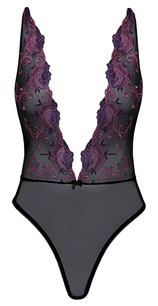 • Schnitt & Material: Extra tief dekolletierter Body aus feinem schwarzem Powernet mit aufwendiger Floralstickerei in Rosé und Lila. Die verstellbaren Träger kreuzen sich im Rücken. 95% Polyester, 5% Elasthan.