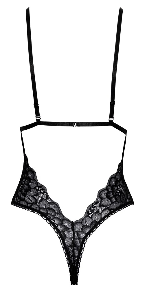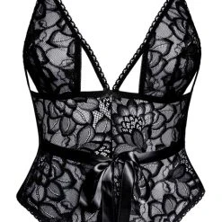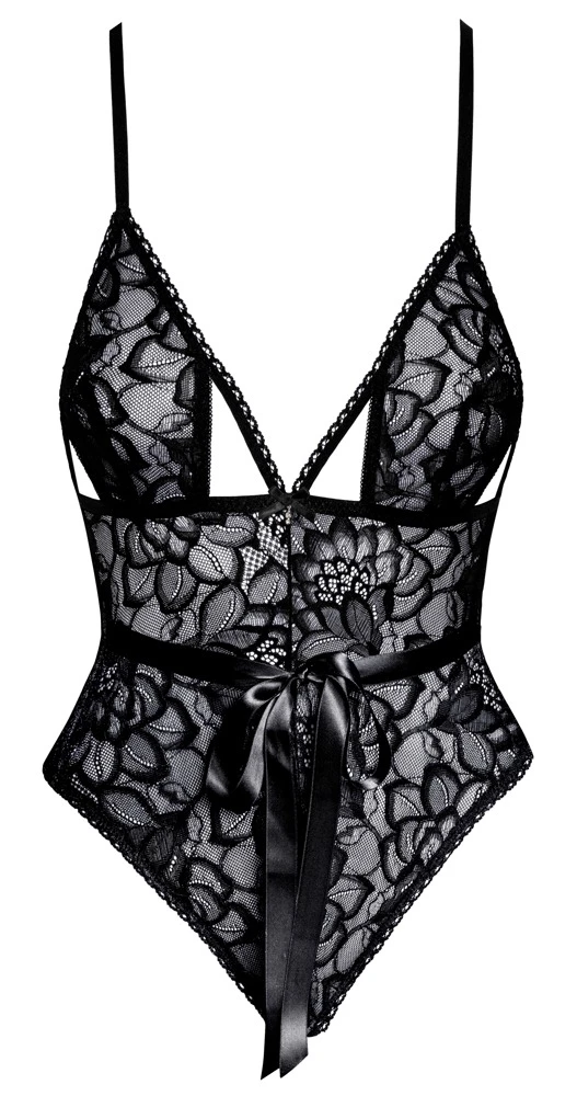 • Schnitt & Material: Eleganter Body komplett aus feiner schwarzer Spitze. Soft-Cups mit Stretchbändern, Träger verstellbar. Mit Satinbändern, die vorne in der Taille zur Schleife gebunden werden. Hinten Hakenverschluss. Hohe Beinausschnitte. 90% Polyamid, 10% Elasthan.
