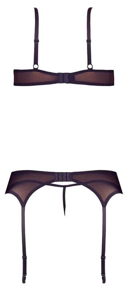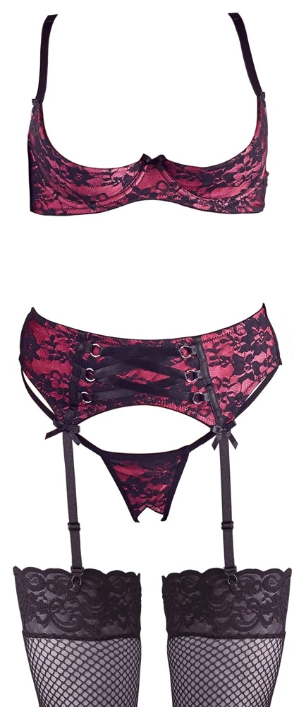 Mit diesem Hebe-Set lenkst Du alle Blicke auf Dich! Die leicht wattierte Büstenhebe setzt Deine Brüste perfekt in Szene. Der dazu abgestimmte Strapsgurt ist ergänzt durch eine dekorative Schnürung in der Front. Der String ist einladend ouvert im Schritt. Perfekt für aufregende Abende!