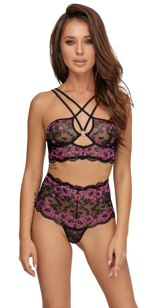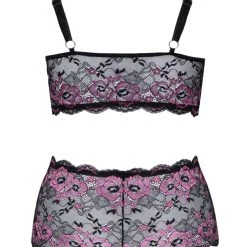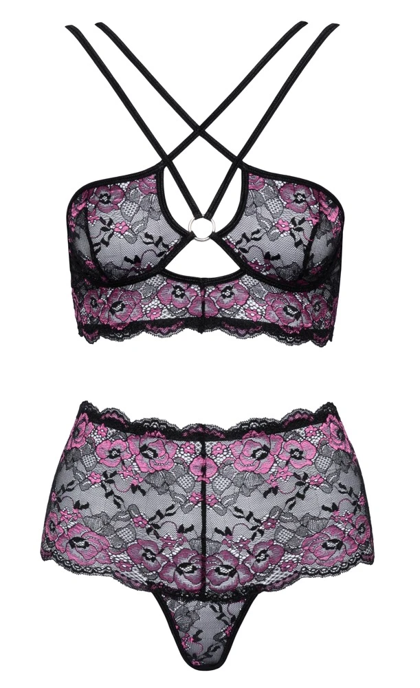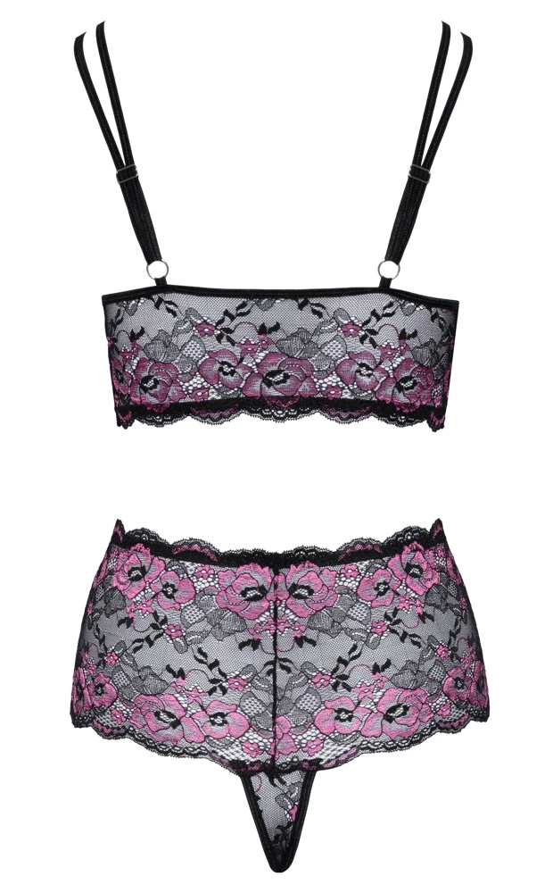 • Schnitt & Material: Etwas länger geschnittener Soft-BH und Taillen-Slip im Set. Aus edler 2-farbiger Blütenspitze. BH im Dekolleté mit Stretchbändern und silberfarbenem Ring. Doppelträger verstellbar. 90% Polyamid, 10% Elasthan.
