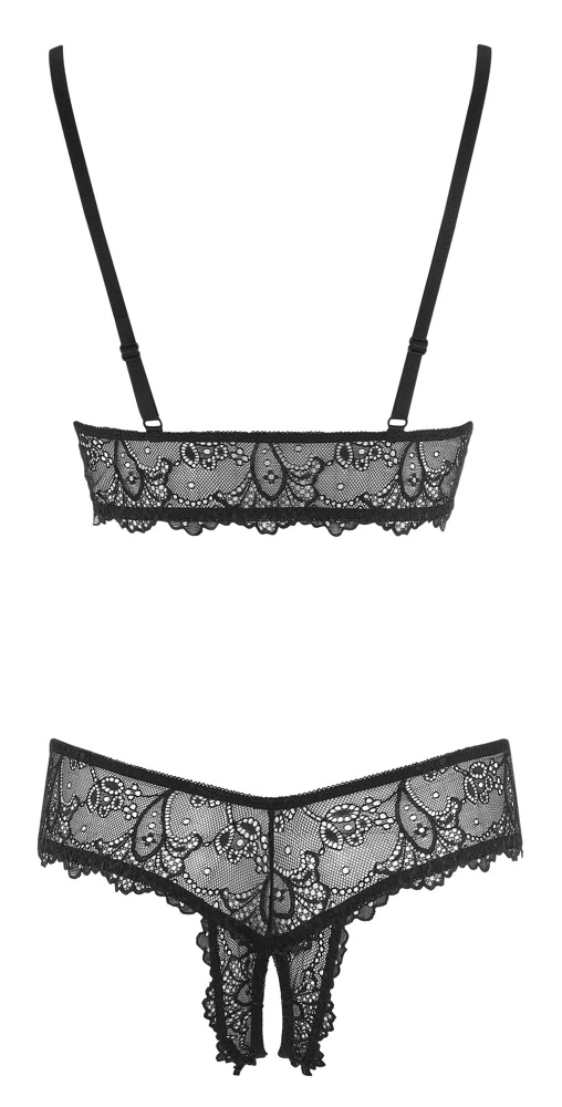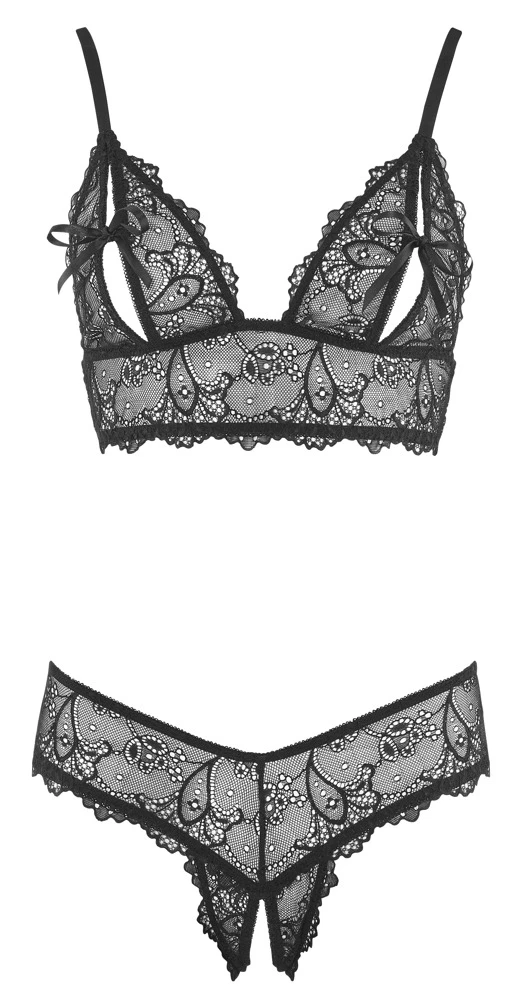 Dieses Set ist rundherum aus zarter Spitze gefertigt, die Deine Haut sinnlich durchschimmern lässt. So ausgestattet, ist Dir Dein Erfolg bei Deinen aufregenden Verführungskünsten sicher! Die weiche elastische Spitze schmiegt sich hauchzart an Deine Kurven und trägt sich einfach nur wunderbar. Der etwas länger geschnittene BH verführt mit seinen geschlitzten Cups, die mit den kleinen Bindeschleifen schnell geöffnet oder verschlossen werden können. Direkte Zugriffsmöglichkeit bietet auch der Riostring mit seinem offenen Schritt. So bleiben keine Wünsche offen…
