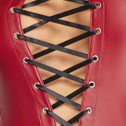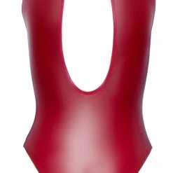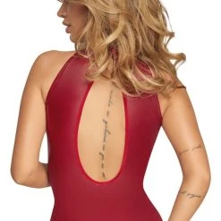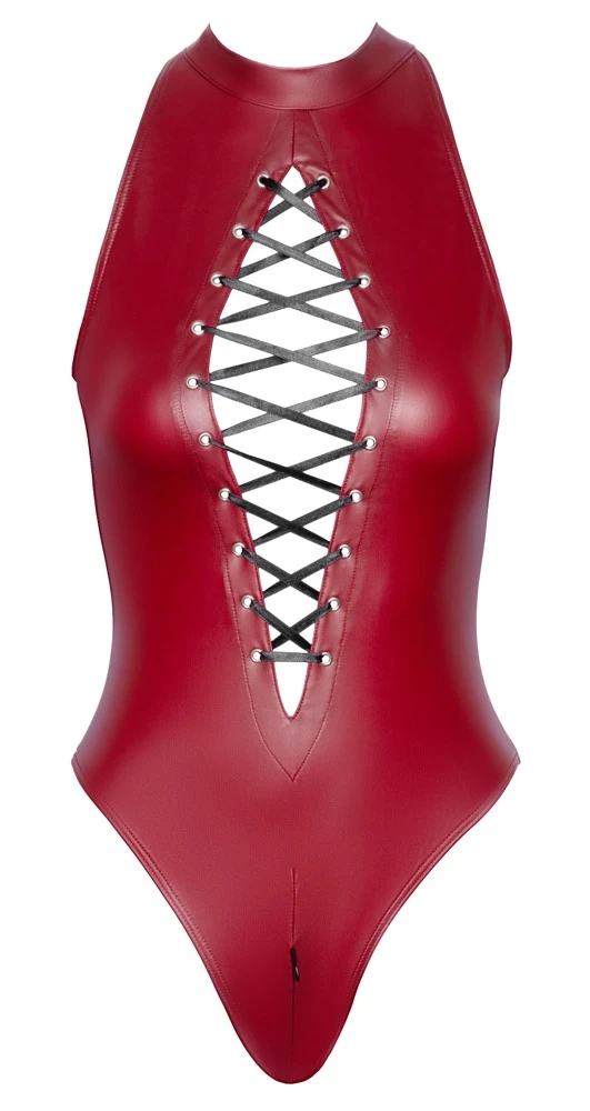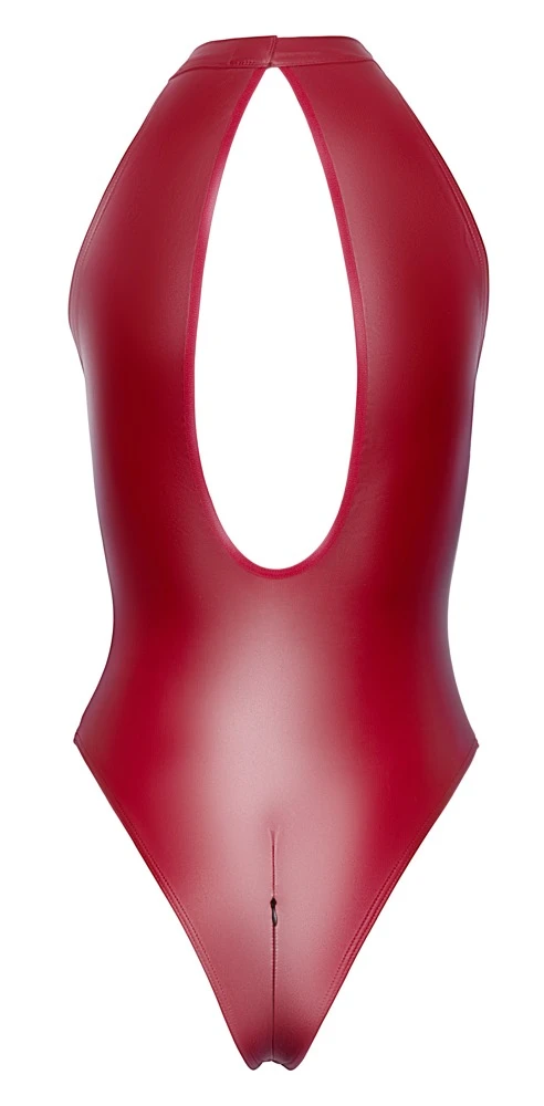 • Schnitt & Material: Knapp geschnittener Riostring-Body im edlen roten Mattlook. Vorne großer Ausschnitt in Schnüroptik mit Stretchbändern. Stehkragen-Neckholder mit Klettverschluss, darunter großer Rückenausschnitt. Extra hohe Beinausschnitte. 2-Wege-Reißverschluss im Schritt bis über den Po. 85% Polyester, 15% Elasthan.