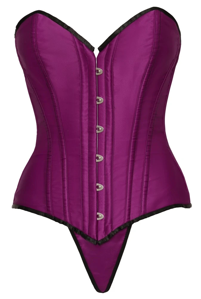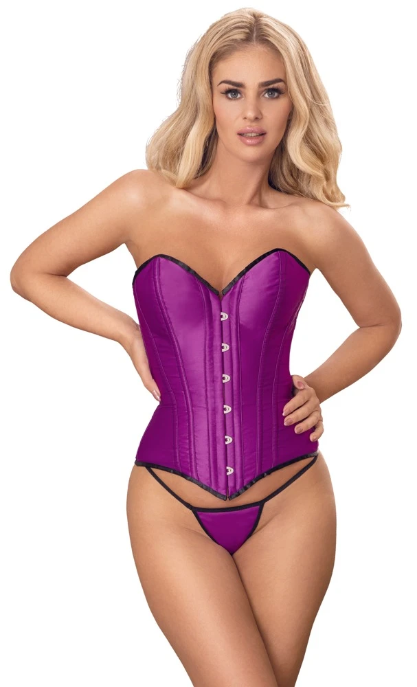 • Schnitt & Material: Trägerlose Vollbrust-Corsage mit kleinem String in Lila mit schwarzen Details. Corsage mit eingearbeiteten Formstäben, vorne mit Haken-/Ösenverschluss. Rücken-Schnürung mit Stoff unterlegt. 100% Polyester.