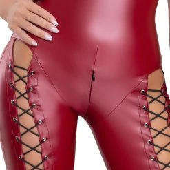 Dieser rundum elastische Overall schmiegt sich mit seinem weichen stylischen Mattlook in edlem Rot wie eine zweite Haut an deine Kurven. Blickfang sind eindeutig deine langen Beine, die vorne sowie hinten von oben bis unten aufregend geschnürt sind. Praktisch und zugleich auch sehr verführerisch ist der lange 2-Wege-Reißverschluss im Schritt, der sich vom Venushügel bis über den Po von beiden Seiten öffnen lässt. Unverschämter kann ein Einteiler nicht sein!
