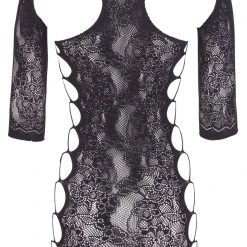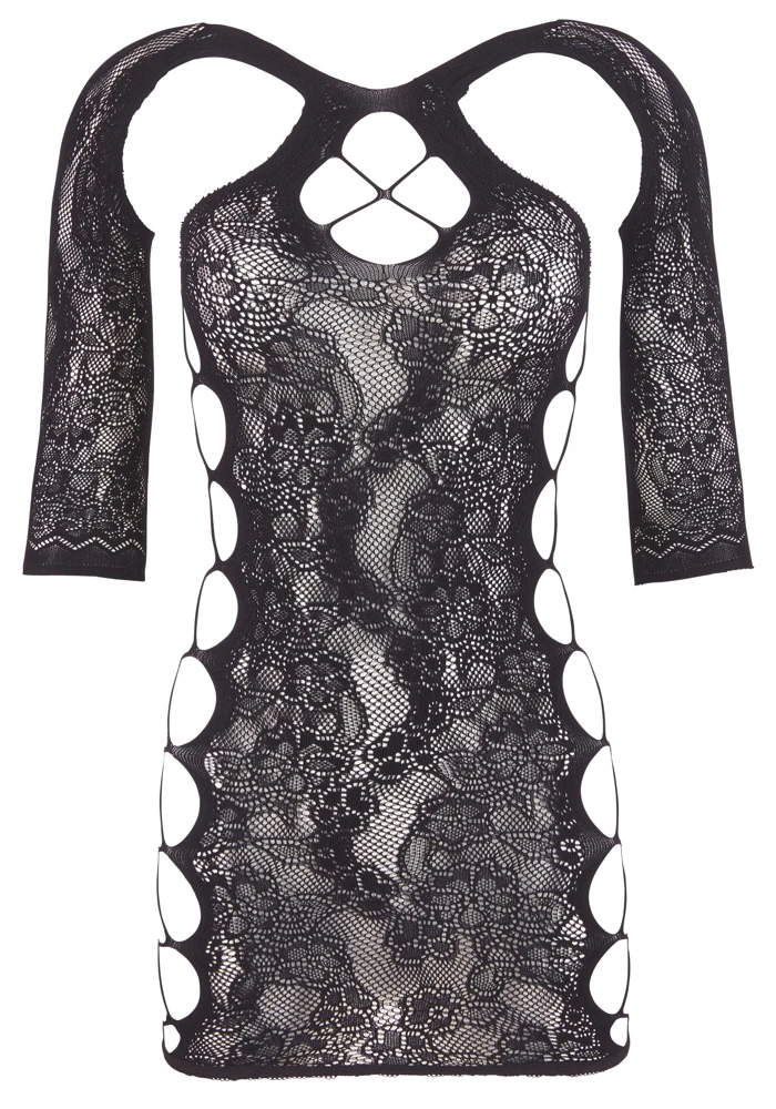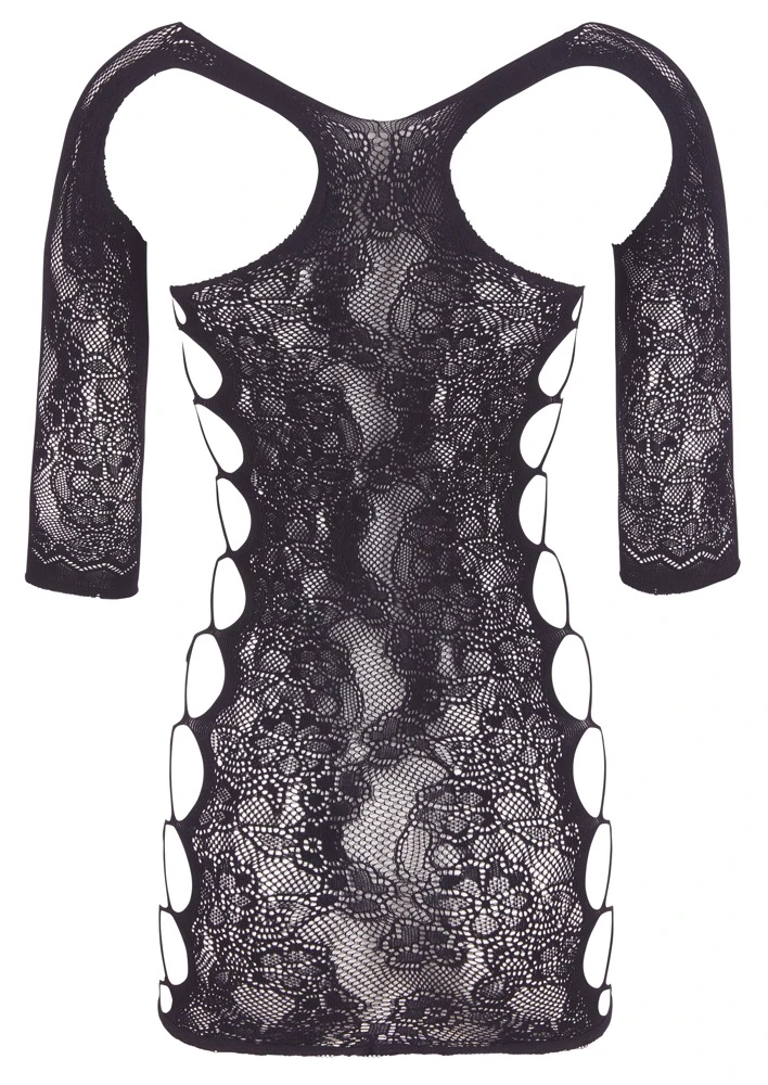 • Schnitt & Material: Schwarzes Halbarm-Minikleid in enger, figurnaher Schnittführung aus hochelastischem Material mit eingewebter Spitzenoptik mit seitlichen Aussparungen in Bänderoptik. Nahtlos gefertigt, sodass keine störenden Nähte auftragen. Dazu passender, kleiner String mit Spitzenfront. 90% Polyamid, 10% Elasthan.