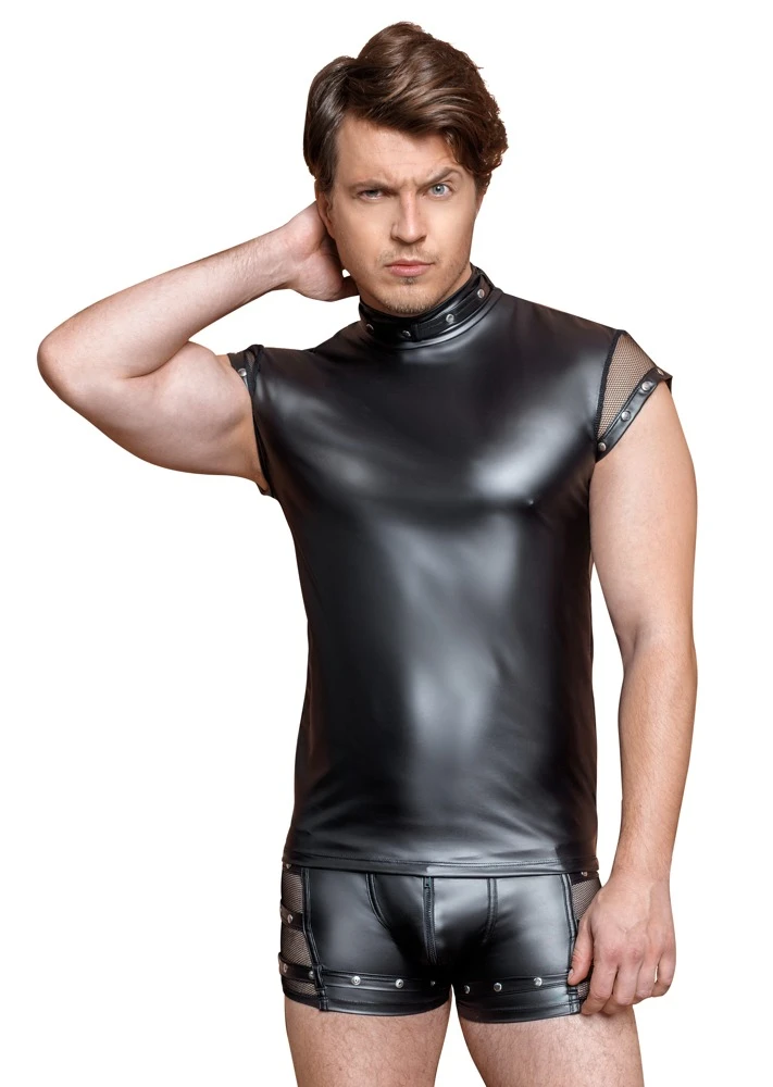 Dieses Shirt im elastischen Mattlook schmiegt sich absolut hautnah an und setzt dich knackig in Szene. Die kleinen Netz-Ärmel, sowie die nietenbesetzten Riemendetails unterstreichen deinen männlich-markanten Look. Den Halsfesselriemen kannst du aber auch komplett abnehmen. Das Shirt trägt sich weich und geschmeidig und bietet dir in jeder Lage perfekte Passform.