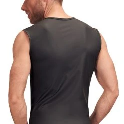 ⹠Schnitt & Material: Schwarzes, Àrmelloses Shirt im betonenden Mattlook mit transparenten Netz-EinsÀtzen vorne seitlich und vorne an der Schulterpartie. 90% Polyester, 10% Elasthan, Polyurethan-Beschichtung; Netz-EinsÀtze 100% Polyester.
