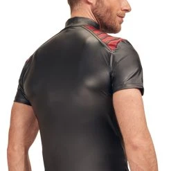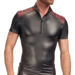 âą Schnitt & Material: Schwarzes Shirt im Mattlook mit roten Streifen-EinsĂ€tzen auf der Schulterpartie. Mit kleinem Stehkragen und ReiĂverschluss vorne. 90% Polyester, 10% Elasthan; EinsĂ€tze 85% Polyester, 15% Elasthan; Polyurethan-Beschichtung.