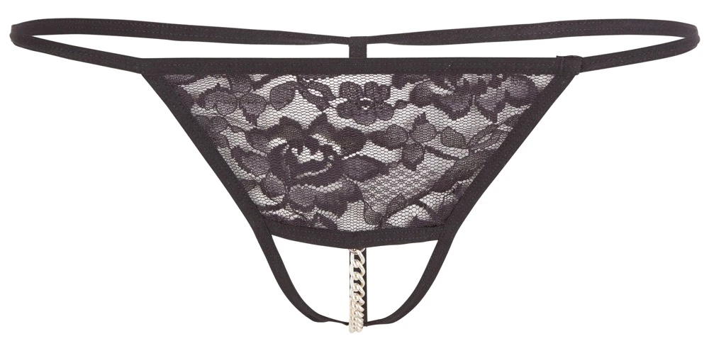 • Schnitt & Material: String ouvert mit Metallkette durch den Schritt. Florale Spitze. 100% Polyamid.