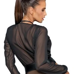 • Schnitt & Material: Langarm-Body mit blusigem Oberteil aus Chiffon und Höschenteil aus feinem Netz. Extra tief dekolletiert mit verstellbarem Steg zum Halsband mit Clipverschluss. Taillen- und Ärmelbündchen aus Power-Wetlook. Höschen mit Haken-Schrittverschluss. Chiffon 100% Polyester; Netz 93% Polyamid, 7% Elasthan.