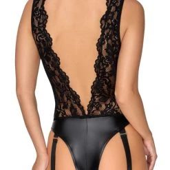 • Schnitt & Material: Straps-Body aus Spitze (Oberteil) und Mattlook (Slipteil). Vorne und hinten extra tief ausgeschnitten, Strassband im Dekolleté vom Halsband bis zur Taille. Halsband mit Verschluss im Nacken. Strumpfhalter und Schenkelriemen verstellbar. Spitze 90% Polyamid, 10% Elasthan; Mattlook 76% Polyester, 24% Elasthan, Polyurethan-Beschichtung.