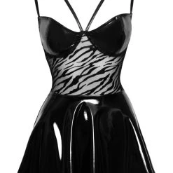 • Schnitt & Material: Kurzes Kleid in enger Schnittführung mit ausgestelltem Röckchen und Bügel-Cups im schwarzen Lackglanz. Mittig transparenter Powernet-Einsatz mit Samtflockprint im Tigerlook. Reißverschluss im Rücken. Raffinierte Doppelträger passend verstellbar. 77% Polyester, 23% Elasthan, Polymerbeschichtung; Powernet 84% Polyester, 16% Elasthan.