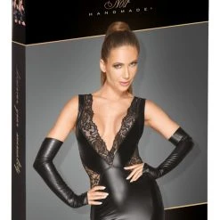 Genieße deinen Auftritt in diesem taillenbetonenden Minikleid im erotisch eleganten Material-Mix aus Powerwetlook und feiner Spitze. Mit dem extra tiefen spitzenverzierten Dekolleté und dem tiefen Rückenausschnitt setzt du zusätzlich höchst verführerische Akzente. Das Kleid schmiegt sich weich und elastisch an deine Kurven und bietet dir trotzdem beste Bewegungsfreiheit bei all deinen Eskapaden. Fühl dich rundum wohl und hochgradig sinnlich und sexy!