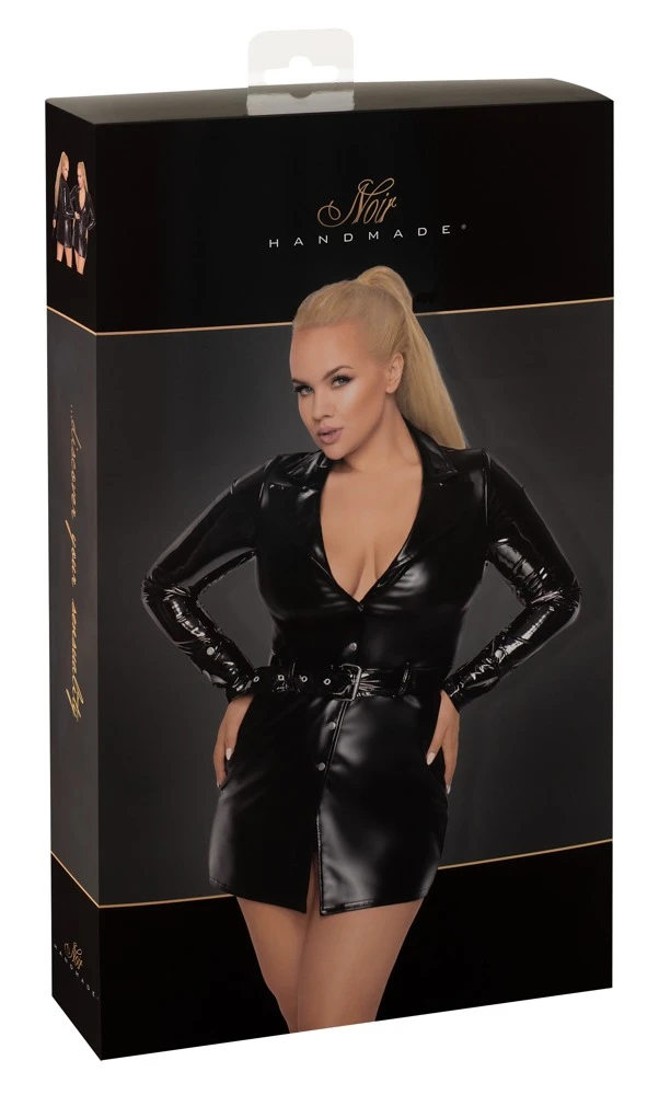 • Schnitt & Material: Extra kurzes Mantelkleid komplett im schwarzen Powerwetlook. Figurnah geschnitten im tief ausgeschnittenen Mantel-Styling mit langem Arm, stilechtem Reverskragen, durchgehender Duckknopfleiste vorne und Bindegürtel. 76% Polyester, 24% Elasthan, Polymer-Beschichtung.