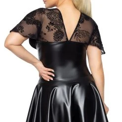 • Schnitt & Material: Kurzes Kleid im Corsagen-Style mit leicht ausgestelltem Röckchen. Schwarzer edler Powerwetlook, tief dekolletiertes Oberteil mit kurzen weiten Ärmeln aus Samtflockprint-Tüll. Vorne durchgehender Reißverschluss. 76% Polyester, 24% Elasthan, Polymer-Beschichtung; Tüll 82% Polyester, 18% Elasthan.