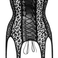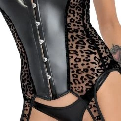 • Schnitt & Material: Trägerloses Strapshemd in zarter Transparenz mit feinem Leo-Samtflockprint. Vorderer Einsatz und Details im matt glänzenden Powerwetlook. Corsagen-Style mit dekorativer Schnürung im Rücken und Haken-Schnellverschluss vorne. 6 breite Strumpfhalter. 90% Polyester, 10% Elasthan; Powerwetlook 76% Polyester, 24% Elasthan, Polymer-Beschichtung.