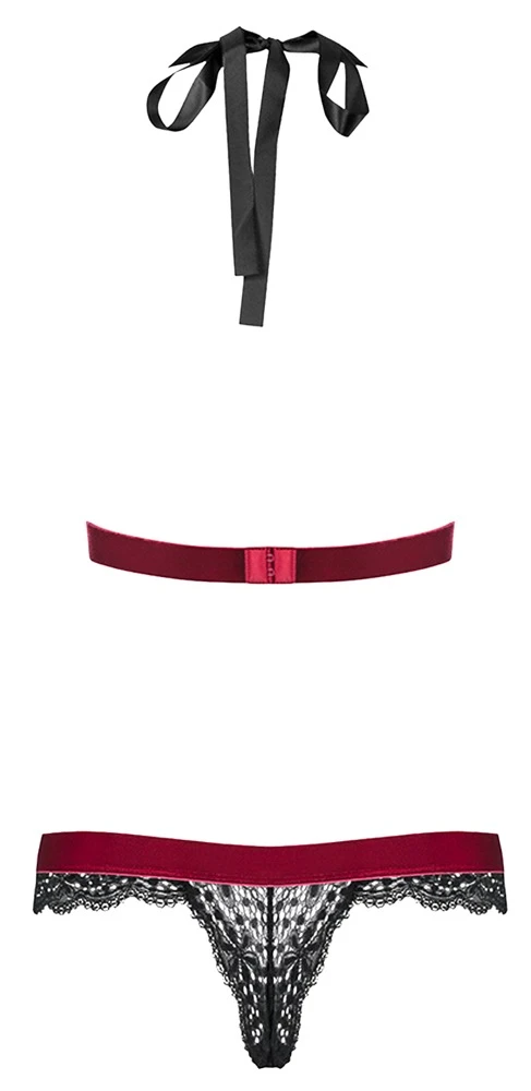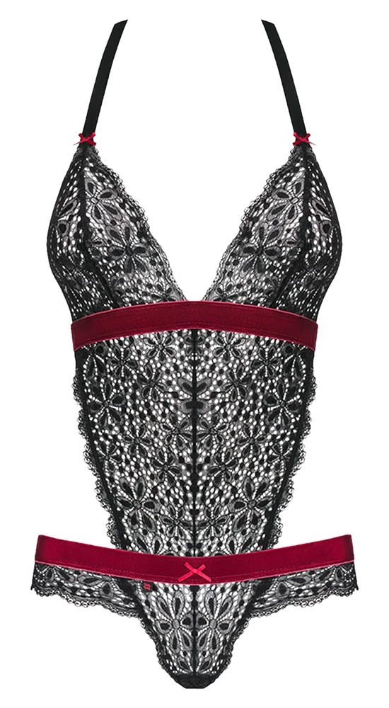 • Schnitt & Material: Rio-Body komplett aus elastischer schwarzer Spitze mit Unterbrustband und Höschenbund aus bordeauxfarbenem Samt. Mit Hakenverschluss im Rücken, Neckholder zum Binden. Nahezu nackte Rückansicht in Zweiteiler-Optik (BH und String). 90% Polyamid, 10% Elasthan.