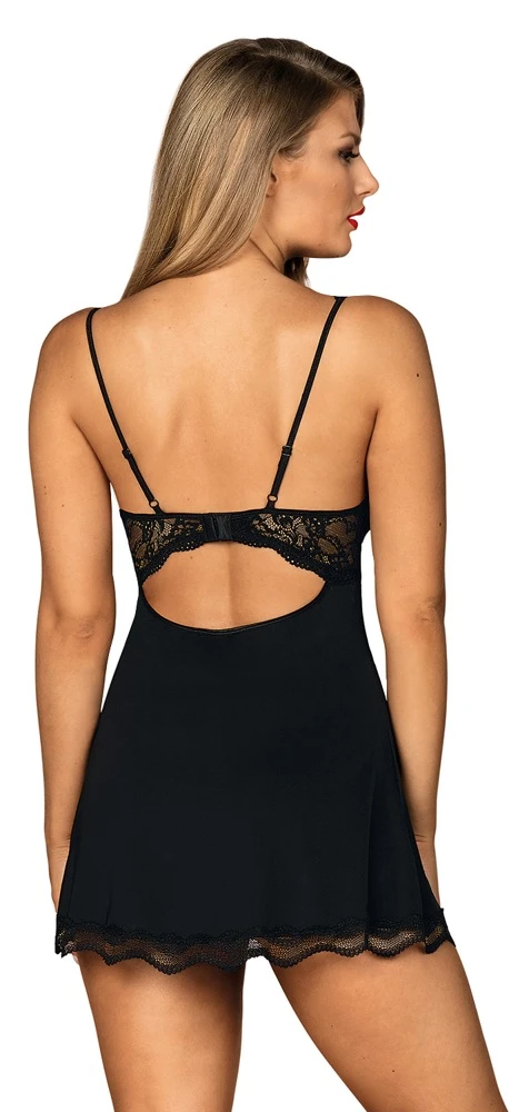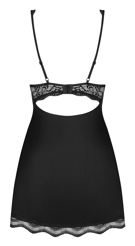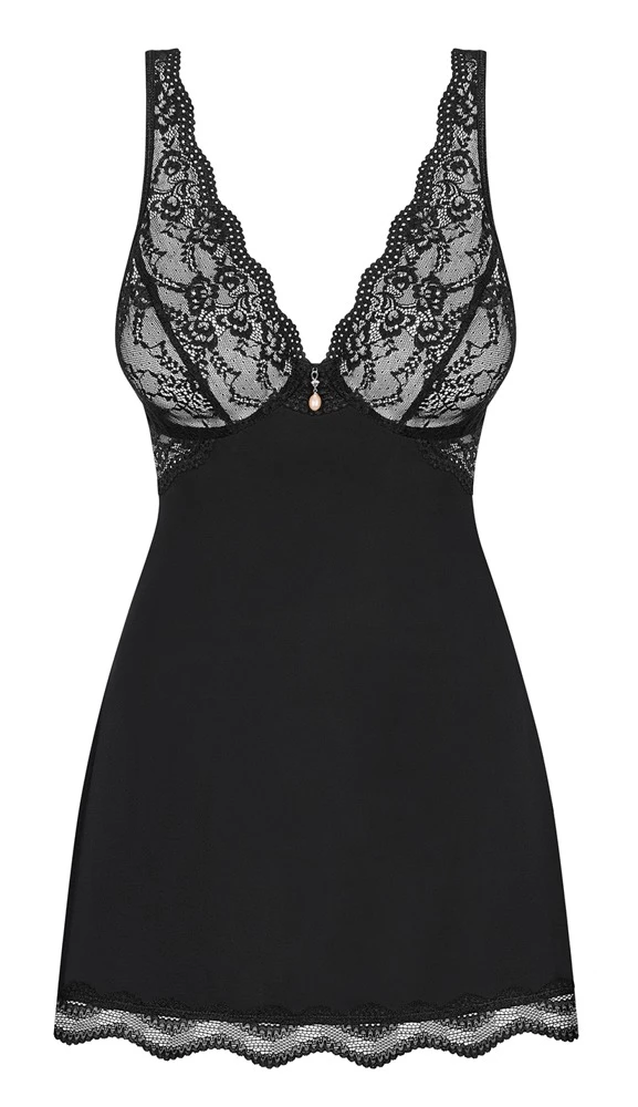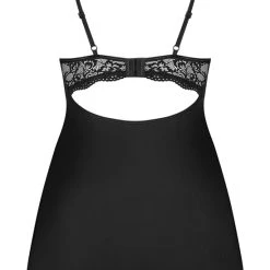 • Schnitt und Material: Tailliertes Negligé, Cups und Saum aus Spitze. Verstellbare Träger, mit Hakenverschluss hinten. Strassdetail am Busen. Mit String. 85% Polyamid, 15% Elasthan.