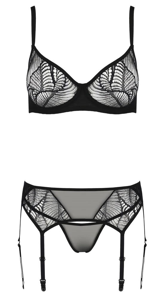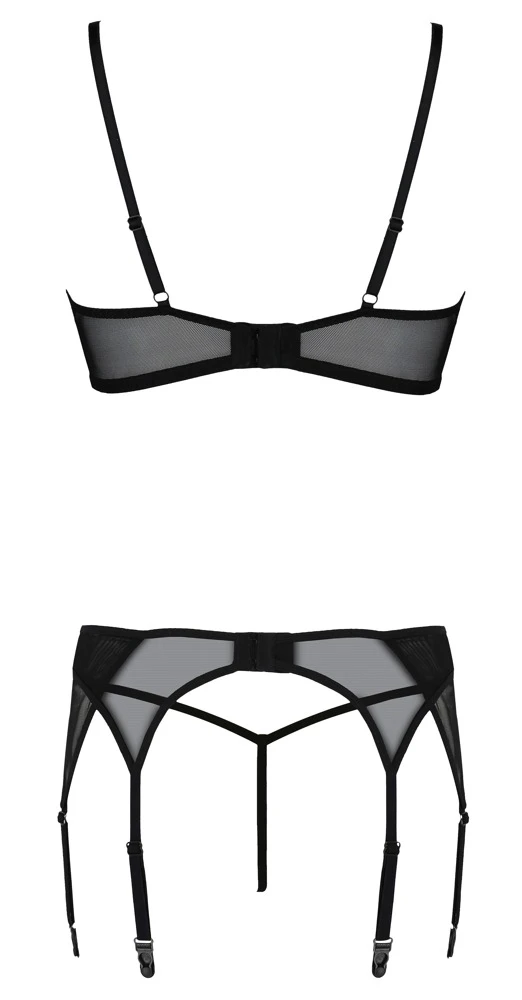 • Schnitt & Material: Bügel-BH, Strapsgurt und String im Set aus transparentem elastischem Powernet, BH und Strapsgurt im Mix mit fantasievoller Spitze in den Fronten. BH und Strapsgurt mit Hakenverschluss im Rücken, 6 Strumpfhalter (3 pro Seite) und BH-Träger in der Länge verstellbar. 47% Polyamid (recycelt), 43% Polyamid (regeneriert), 7% Elasthan (regeneriert), 3% Lycra.