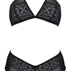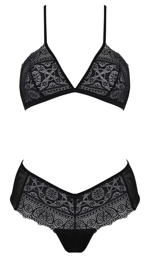 • Schnitt & Material: Soft-BH und Slip aus elastischem Powernet mit bildschöner Spitze in den Fronten. Slip über dem Po doppellagig gearbeitet. Im Rücken kreuzen sich die BH-Träger in einem Ring und sind verstellbar. 47% Polyamid (recycelt), 43% Polyamid (regeneriert), 7% Elasthan (regeneriert), 3% Lycra.