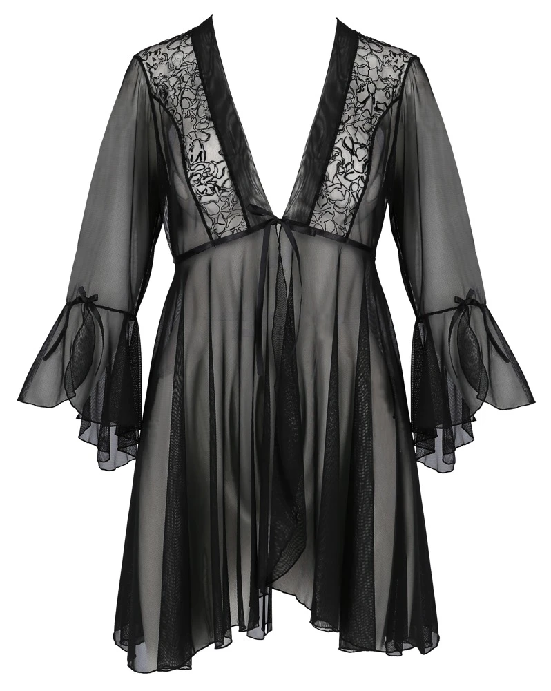 Dieser kurze schwingende Kimono hüllt dich wie ein Windhauch in eine zarte Transparenz, die deine Kurven sanft umschmeichelt und aufregend durchschimmern lässt. Die Einsätze aus feiner Ausbrenner-Spitze unterstreichen dazu deinen elegant-erotischen Auftritt. Ob du den Kimono nun morgens oder abends trägst, ob du splitterfasernackt oder mit Dessous darunter ausgestattet bist, ob offen oder mit geschlossener Bindeschleife getragen: Fühle das streichelweiche zarte Netzmaterial auf deiner Haut und genieße die Blicke, die sich nicht von dir abwenden können!