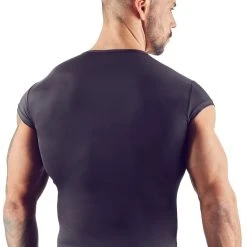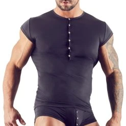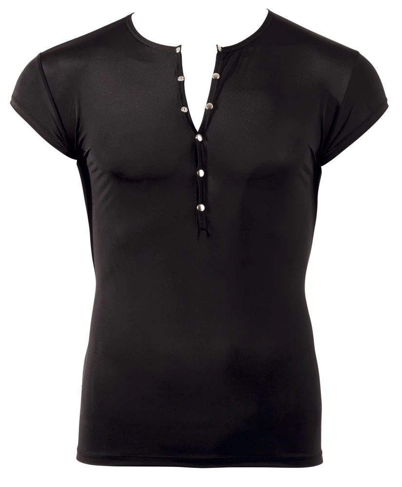 Das schwarze Shirt ist aus extra dünner Mikrofaser gefertigt. Dieses weiche, elastische Material hat einen herrlich weichen Griff und sorgt für hohen Tragekomfort und ein wunderbar leichtes Tragegefühl! Vorne ist eine kurze silberfarbene Druckknopfleiste eingearbeitet, die dem schlichten Shirt eine edle Note verpasst.