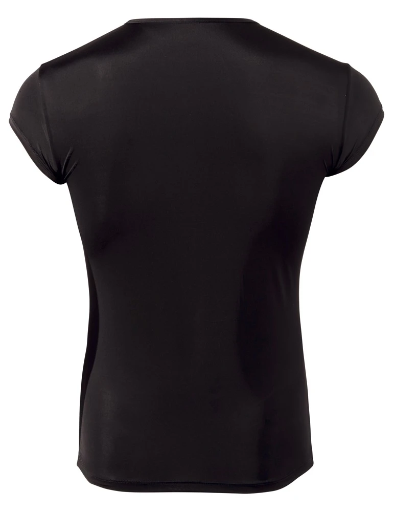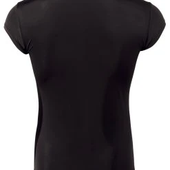 • Schnitt & Material: Leicht transparentes schwarzes Shirt aus elastischer, hauchdünner Mikrofaser. Mit kurzem Arm und silberfarbener Druckknopfleiste vorne. 85% Polyamid, 15% Elasthan.