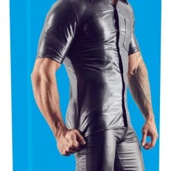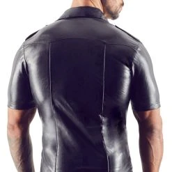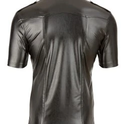 Druckknopfleiste, Schulterklappen und Brusttasche dominieren das Hemd aus glänzend schwarzem Lederimitat. Muskelbetonend geschnitten und leicht tailliert. Top auch zu Jeans!