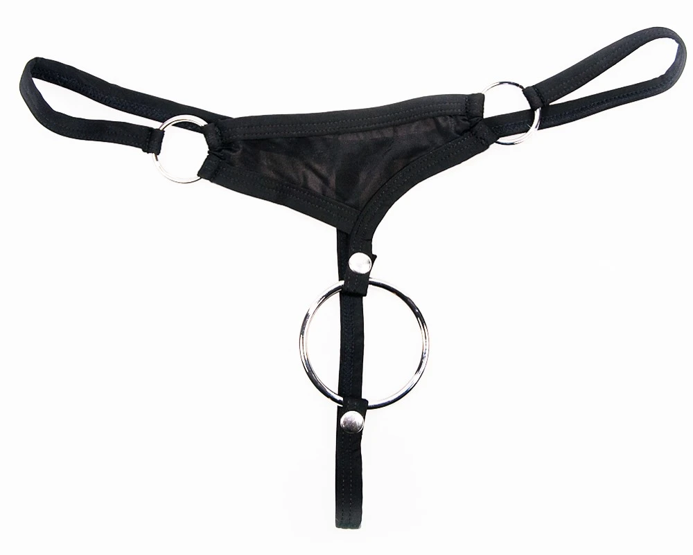 Scharf geschnittener Ministring mit Metall-Penisring (Ø 5 cm) für die maximale Präsentation der Männlichkeit. String aus schwarzer, weicher Mikrofaser, mit schmalen, bezogenen Stretchbändern. Penisring dank Druckknöpfen abnehmbar.