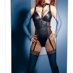 • Material und Schnitt: Schwarzer Leder-Body mit verstellbaren Trägern, Halsband und Gürtel. Reißverschluss im Rücken. Powernet an den Seiten, sowie abnehmbare und justierbare Strumpfhalter. Leder (Lamm, chromfrei gegerbt); Powernet 90% Polyester, 10% Elasthan.