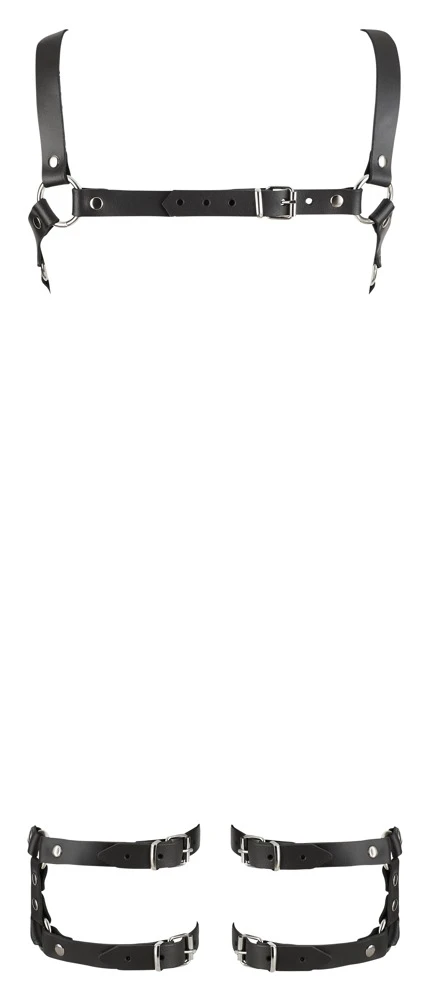 • Schnitt & Material: Brustharness mit abnehmbaren Oberschenkelfesseln. Einfacher Karabinerverschluss. Spaltleder (Rind, chromfrei gegerbt), Metall.