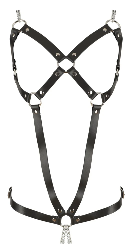 Dieser verführerische Harness besteht aus Lederriemen, kombiniert mit stählernen Ringen, Metallketten-Trägern und zwei Metallketten im komplett offenen Schritt. Alle Riemen verstellbar für perfekte Passform. So bist Du immer verführerisch vorbereitet!